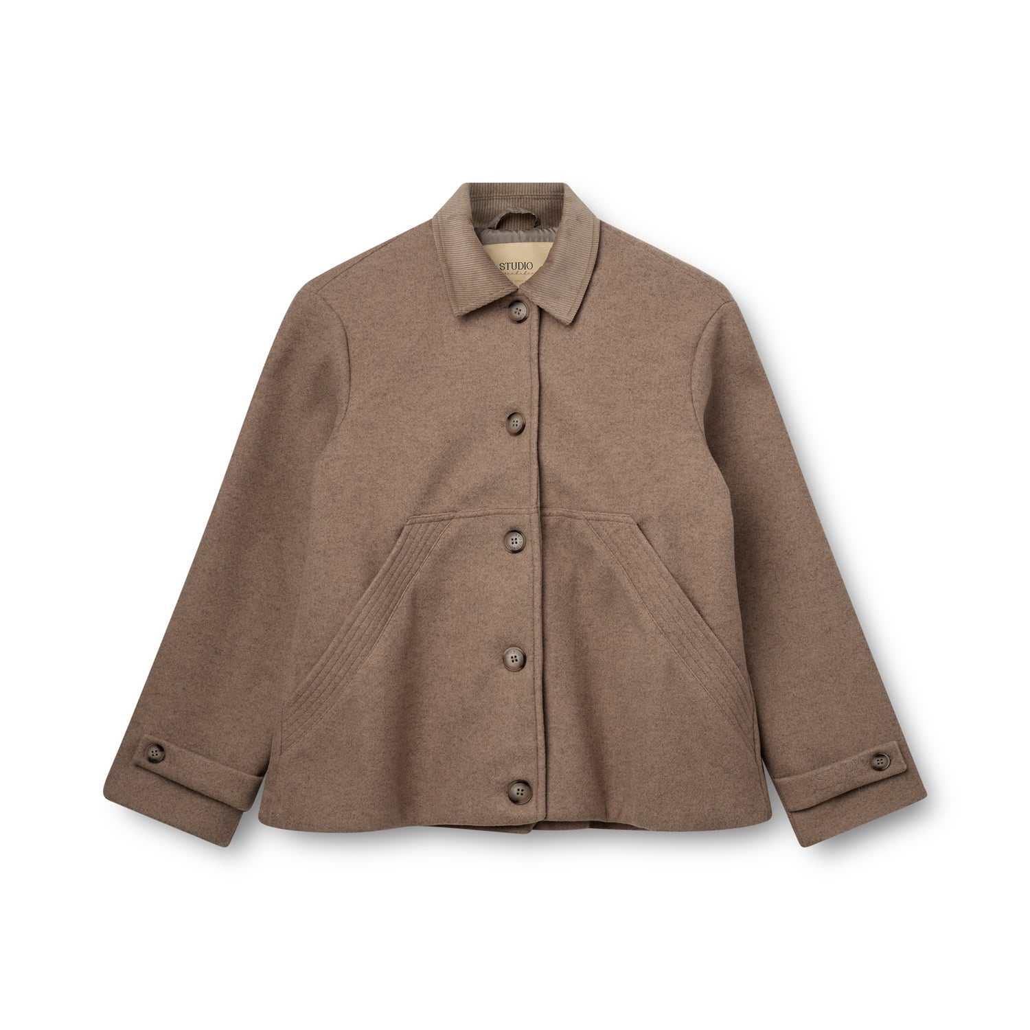 Jakken er fremstillet i slidstærkt polyester, der giver et eksklusivt uld-look, men samtidig føles let og behagelig at have på. Den gennemknappede front, skjortekraven og de praktiske sidelommer skaber en balanceret kombination af funktion og æstetik. Den varme, brune nuance tilføjer et naturligt og tidløst præg, der passer perfekt ind i enhver garderobe.